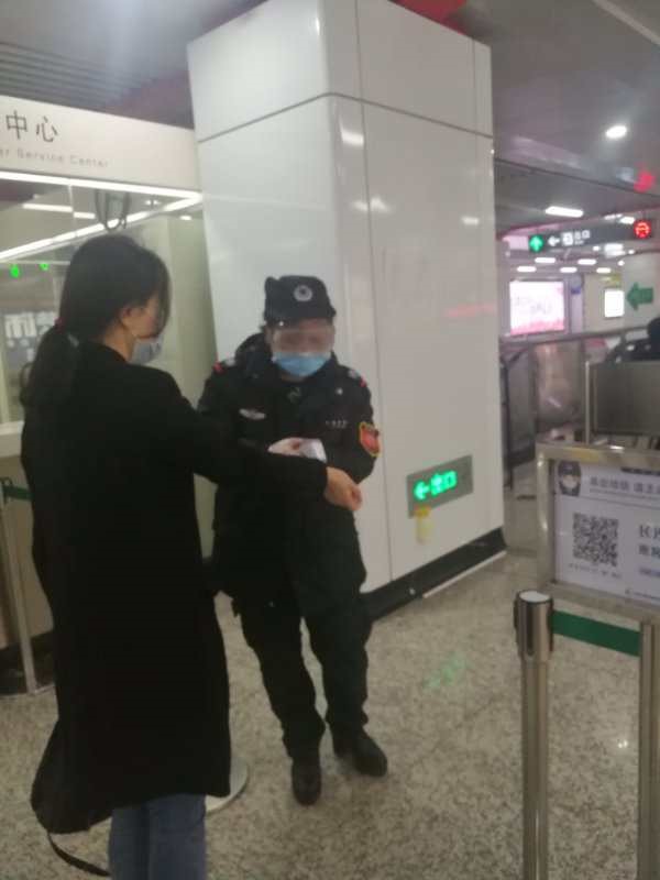 2017级口腔医学二班向镜儒同学主动报名参加志愿者,协助长沙地铁站给往来乘客测量体温,服务大众,受到好评。